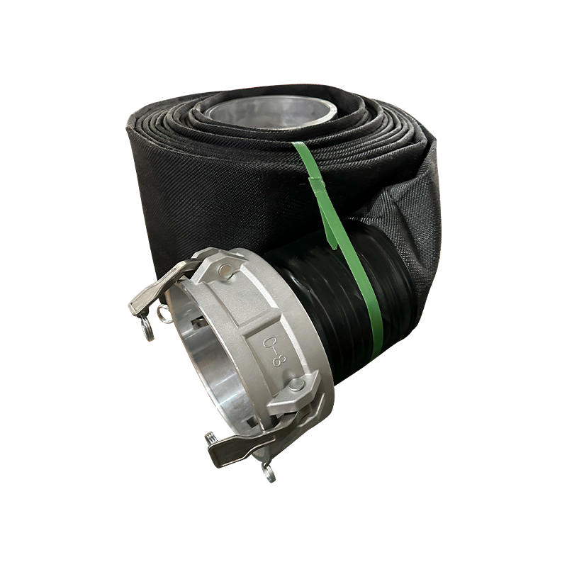 8-Zoll-Bergbau-Flachschlauch mit Storz-Anschlüssen, Hochleistungs-Flachschlauch für Hochdruckentwässerung im Bergbau. Mit Storz-Schnellkupplungen und kompakter Aufbewahrung.